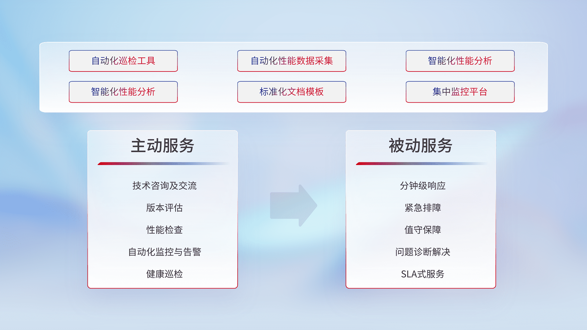 智能化工具和标准化文档,,,保障服务质量,,,提供主动服务(包含技术咨询、、、、版本评估、、、、性能检查、、、自动化监控与告警、、、、健康巡检)和被动服务包含(分钟级响应、、、紧急排障、、、、值守保障、、、问题诊断解决、、、、SLA服务)。。。